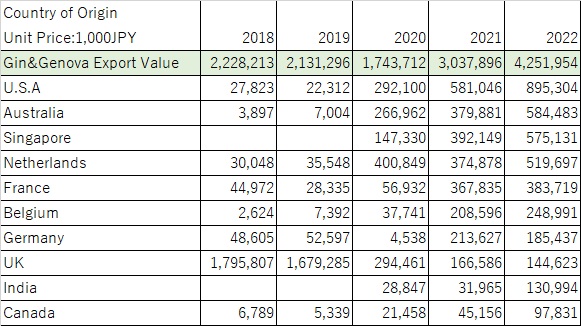 While the increase in the number of licenses is not surprising given the recent global boom in gin and Japanese whisky (not all licensed spirit producers make gin), the two categories are structured differently in terms of exports.