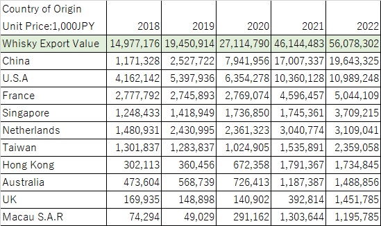 Whisky, on the other hand, is the largest Japanese liquor product, reaching 56 billion yen, with 65 exporting countries. What is noteworthy is its unit price. The average unit price for a 700 ml bottle is 2,754 yen, about five times that of gin, and even after three or more years of aging, the strong demand for whisky has kept the unit price high. The top export destination is China, with exports reaching approximately 20 billion yen, and exports are dispersed throughout Asia, North America, Europe, and Oceania.
